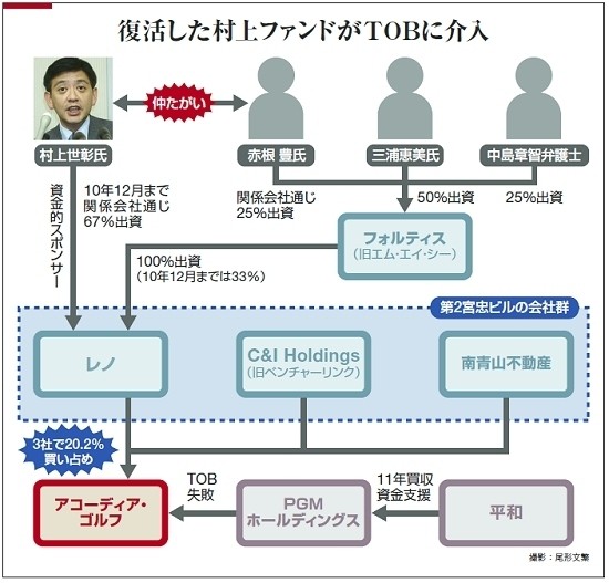 1月中旬、不成立に終わったPGMホールディングスによるアコーディア・ゴルフに対する敵対的TOB(株式公開買い付け)。その最終盤で突如、大株主に躍り出た金融会社「レノ」こそが新生・村上ファンドの中核会社だ。150億円超を一気に投じて約2割の株式を握り、買い占め先に書簡を送りつけて自社株買いを迫る──。そのやり口は全盛期を彷彿とさせるものだった。