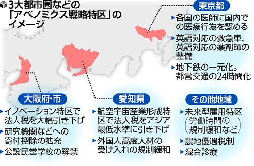 > 政府が東京、大阪、名古屋の三大都市圏を中心に、規制緩和や税制優遇を実施する