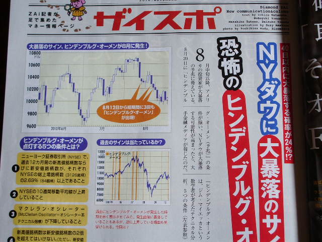 >8月に現れ、市場で話題となった「ヒンデンブルグ・オーメン」だ。当時はバーナンキ>米連邦準備理事会(FRB)議長がジャクソンホールでの講演でQE2(量的緩和第2弾)>を示唆したことで暴落は回避されたが、また、バーナンキに有害無益なQEをおかわりさせるための、屁理屈だな