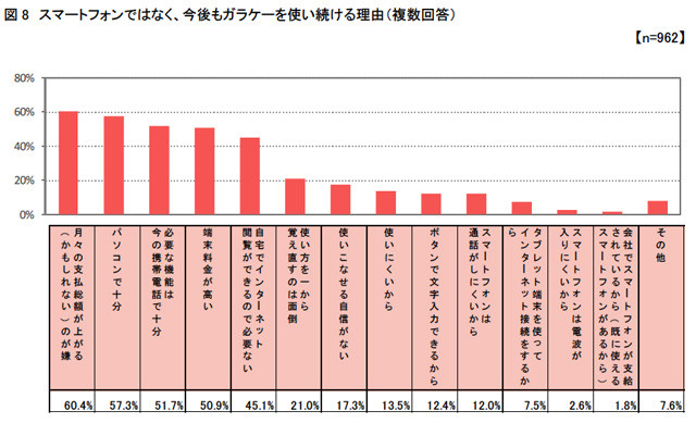 このほか、ガラケー継続層に対して、スマートフォンへ買い替えない理由を尋ねた質問では、「月々の支払い総額が上がる(かもしれない)のがイヤ」という回答が最も多くなっている