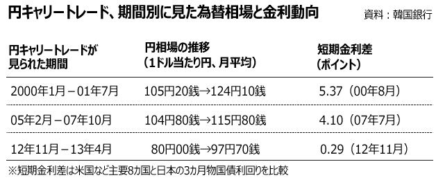 一方、IM投資証券のイ・ジョンウ・リサーチセンター長は「円キャリートレードが増える可能性があるが、日本と先進国の金利差が小さいため、2000年代の初めや半ばのような大規模な流れにはならないのではないか」と予想した。韓銀によると、2000年以降、円キャリートレードは3回活発化したが、過去には先進国と日本の金利差が4-5ポイントに達していたのに対し、現在の金利差は0.29ポイントにとどまっている。