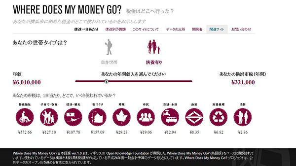 http://www3.nhk.or.jp/news/html/20130720/k10013177541000.html 自治体に払った税金が具体的にどのように使われているのか、一人ひとりの年収に応じて調べることができるWEBアプリ“税金はどこに行った?”(Where Does My Money Go?)を広げようというイベントが、20日、東京で開かれました。