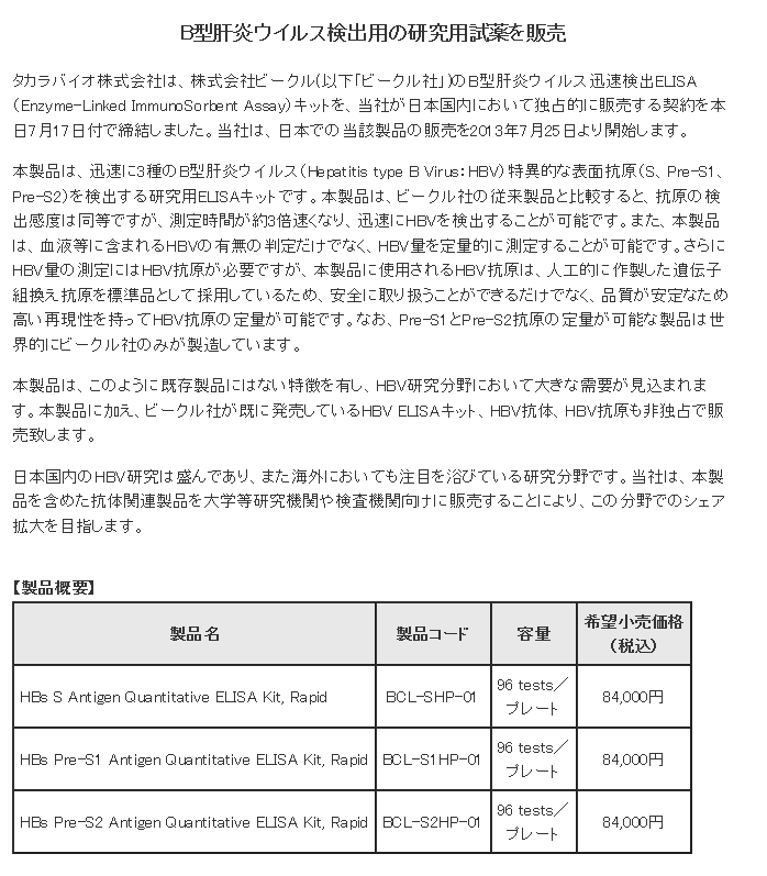 タカラバイオ、B型肝炎ウイルス検出用の研究用試薬を販売