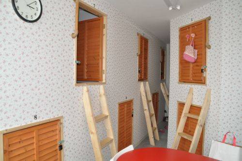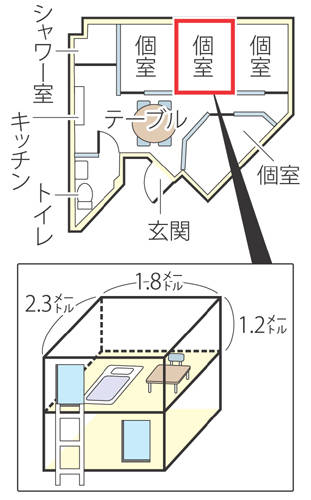 各個室にテレビや布団、照明器具がつき、外出時は南京錠で施錠し、入室時も内側から鍵がかけられるが、個室を隔てる壁は薄い。