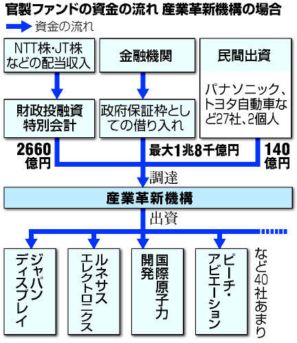 官製ファンドの資金源は、NTT株やJT株の配当収入による財政投融資特別会計や、政府保証をつけた民間金融機関からの借り入れなどだ。