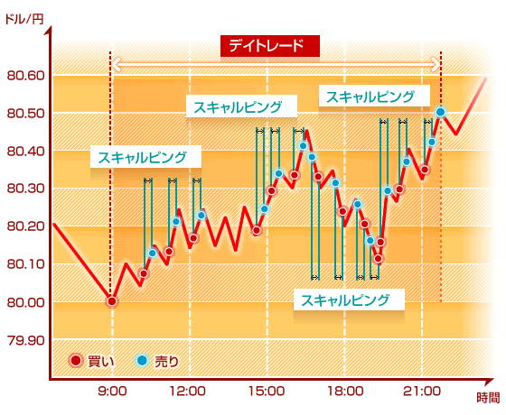 一日のうちに複数の売買を行い、細かく利鞘を稼いで取引を終了させる手法。