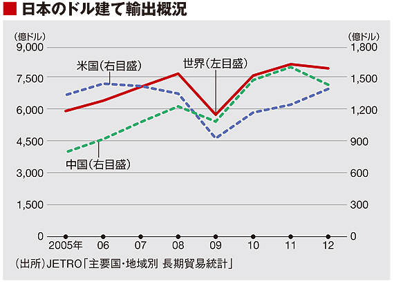 日本のドル建て輸出総額は、リーマンショック後に大きく落ち込んだが、その後回復し、11年にはリーマンショック前のピークをやや上回る水準にまでなった。こうなったのは中国に対する輸出が急増したからだ。05年には対中輸出は対米輸出の約60.0%しかなかったが、リーマンショック後に逆転し、11年には対米輸出より28.5%ほど多くなった。