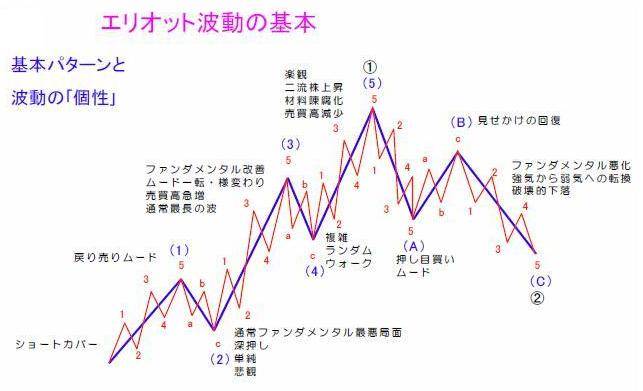今回のようなドル・円の上昇相場では、推進波5波のうち第1、3、5波が上昇、その間の第2、4波が下降となり、5波動完了後は下降、上昇、下降の調整3波が続くとされる。