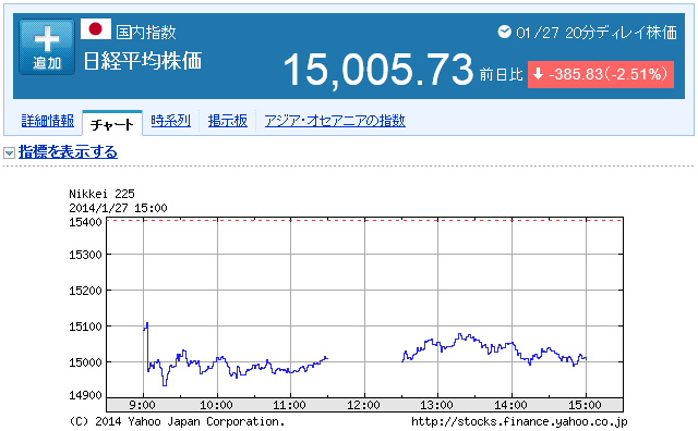 日経平均株価の終値は、前週末比385円83銭安の1万5005円73銭。