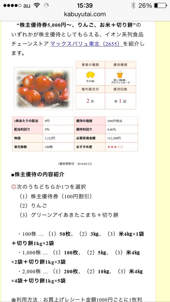 昨日までここの株を100株持ってるとリンゴが3キロが貰えた