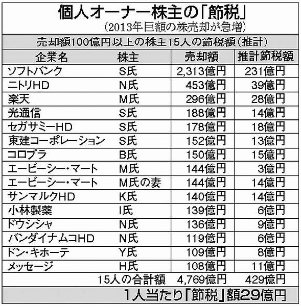 大門氏が示したのは2013年に売却額が100億円を超える株主15人の「課税逃れ」の試算(表)。売却額から取得費用の推定額を引いた利益から計算した「節税」額は計429億円、1人当たり29億円にのぼります。