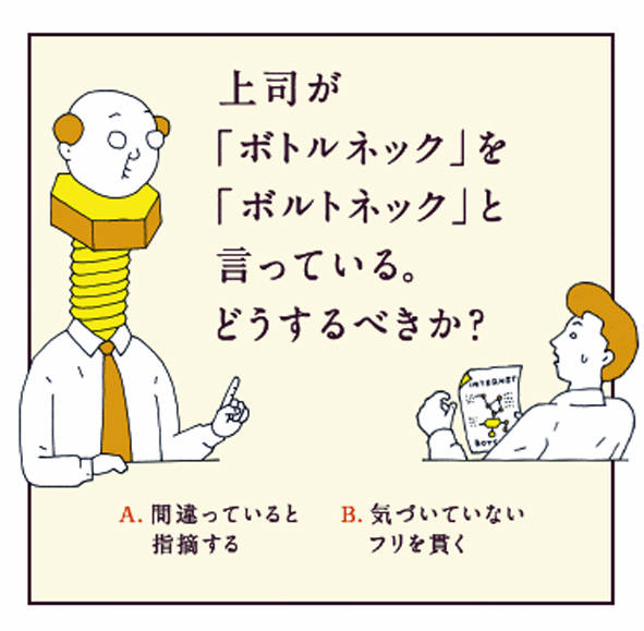 とはいえ指摘の仕方には注意したい。「自分も、たまに『ボトルネック』を『ボルトネック』って言い間違えちゃうんですよねー」と、あくまでも勘違いではなく、言い間違いですよね?という助け舟を出し、上司の面子に配慮すべきだ。