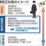 1: 限定正社員に反対、賛成?そのメリットとデメリット 2013/11/05(火) 政府、経済界、労働界の代表による会議が開かれ、甘利経済再生担当大臣は、非正規労働者の正社員化を進めるためには、勤務地や職種などを限定した正社員を普及させ、多…